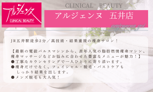 アルジェンヌ 五井店五井駅から徒歩2分09:30~20:00(平日) 09:30~18:00(土日) 定休日:第2・4日曜日、祝日地域密着30年の実績を持つ五井のトータルビューティサロン。痩身実績と美肌脱毛が評判で、無料カウンセリング・都度払い対応で始めやすい。顔・VIO・全身メニューや襟足など細かな部位対応、個室施術とJR五井駅徒歩2分の好アクセスが魅力です。1回あたり料金(税込)1,100円/回〜公式サイトを見るプラン1回あたり(税込)総額(税込)回数期間回数券ワキ脱毛(都度払い)¥1,150/回¥1,1501回-他11件のプランを見る