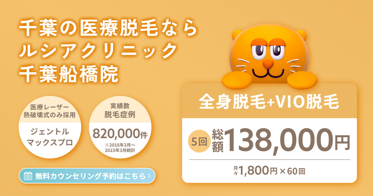 ルシアクリニック 千葉船橋院京成船橋駅から徒歩3分月~土 11:00~20:00 日祝 10:00~19:00厚生労働省承認の熱破壊式レーザー(ジェントルレーズプロ・ジェントルマックスプロ)を使い分け、全身+VIO+顔を1回で照射可能。短期間で効果を出すハイスピード施術と肌トラブル時の専門医対応が強みです。1回あたり料金(税込)14,190円/回〜公式サイトを見るプラン1回あたり(税込)総額(税込)回数期間回数券顔脱毛(都度)¥16,500/回¥16,5001回-他21件のプランを見る