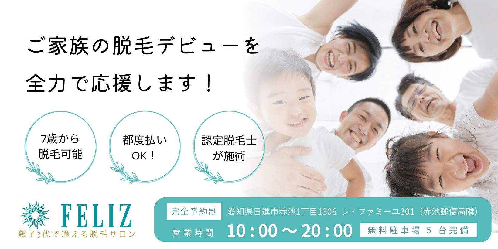 FELIZ赤池駅から徒歩2分11:00~20:00親子3代で通える日進の脱毛サロン。認定脱毛士が肌質と毛質を見極め出力を算出し、国産マシン「マスターライトV3」で敏感肌や小学1年生からのキッズにも配慮。都度払い対応で平均6回前後で効果を目指せる点が強み。1回あたり料金(税込) -公式サイトを見る