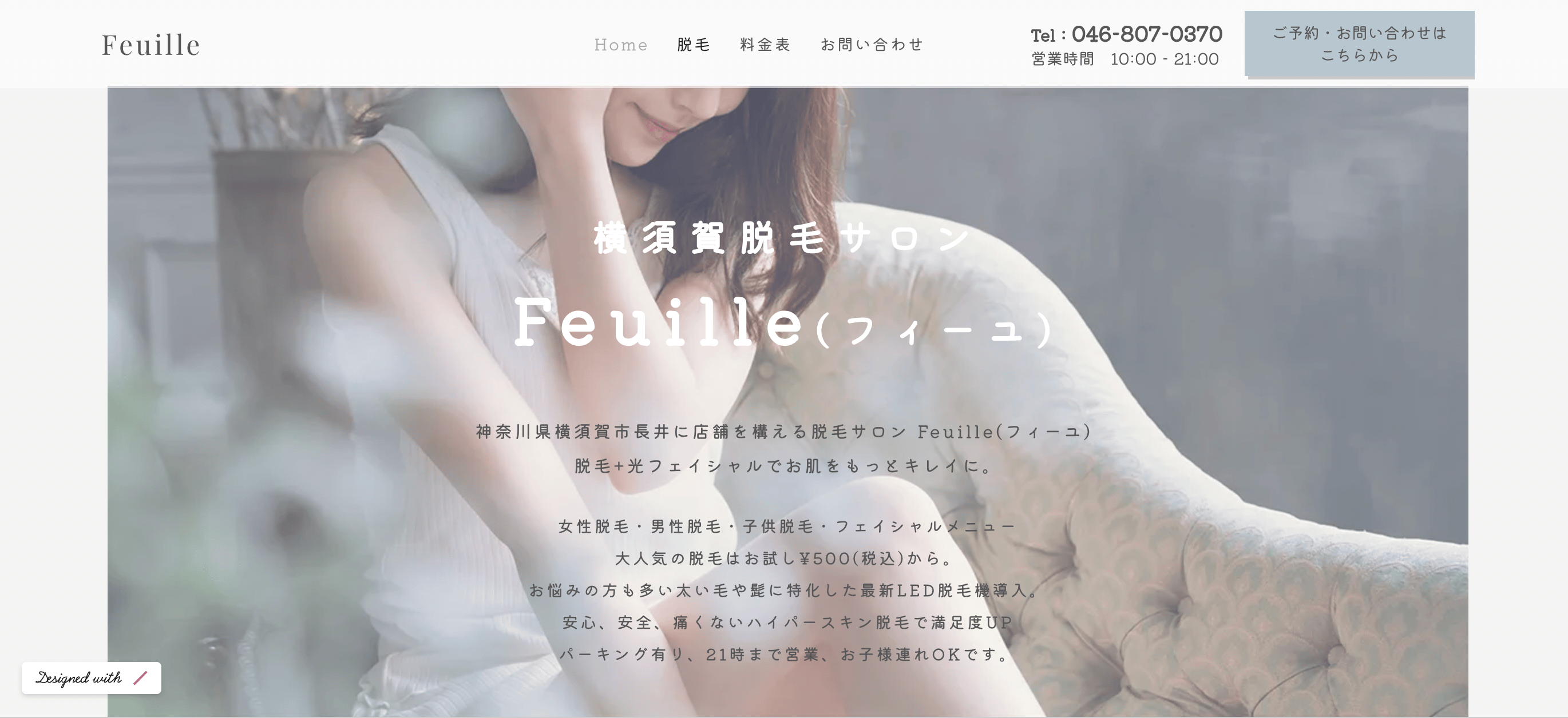 | 概要 | 1台の施術ベッドで完全個室のプライベートサロン。SHR+IPLの最新マシンで痛みを抑えつつ毛質や肌状態に合わせて照射深度を調整。丁寧なカウンセリングと無理な勧誘なしで、気になる箇所だけ選べる全身脱毛が好評。 |